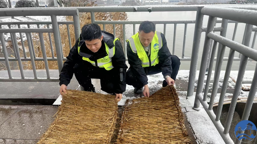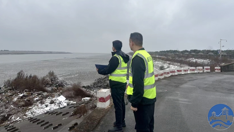 精准排查,细致维护除隐患。风雪中,巡查队伍身着厚重防寒服,穿梭在站区、长江堤防各个角落,开展“全覆盖、无盲区”的设施排查。在闸室,工作人员仔细检查闸门维修后密封性能、启闭机运行状态;在泵站,他们用测温仪监测机电设备温度,对疑似结冰部位及时喷洒防冻液,反复调试确保操作灵活;在堤防及穿堤建筑物旁,逐一排查混凝土结构有无冻裂、渗漏痕迹,对边坡、堤脚等易积水结冰区域,及时清除积雪积冰,防止冻胀损坏设施。“风雪越大,越要盯紧细节,哪怕是一颗螺丝松动、一处轻微渗漏,都可能引发大隐患。”在闸站转弯路口、便民桥等人员通行频繁区域,工作人员及时铺设防滑草垫,清扫积水冰层,保障巡检与应急通行安全。