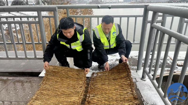 精准排查,细致维护除隐患。风雪中,巡查队伍身着厚重防寒服,穿梭在站区、长江堤防各个角落,开展“全覆盖、无盲区”的设施排查。在闸室,工作人员仔细检查闸门维修后密封性能、启闭机运行状态;在泵站,他们用测温仪监测机电设备温度,对疑似结冰部位及时喷洒防冻液,反复调试确保操作灵活;在堤防及穿堤建筑物旁,逐一排查混凝土结构有无冻裂、渗漏痕迹,对边坡、堤脚等易积水结冰区域,及时清除积雪积冰,防止冻胀损坏设施。“风雪越大,越要盯紧细节,哪怕是一颗螺丝松动、一处轻微渗漏,都可能引发大隐患。”在闸站转弯路口、便民桥等人员通行频繁区域,工作人员及时铺设防滑草垫,清扫积水冰层,保障巡检与应急通行安全。